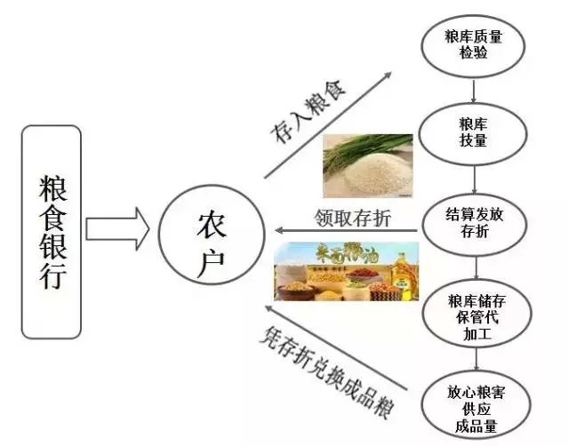農(nóng)民打下新糧,存入企業(yè)提供的糧倉(cāng),定期或活期自由選擇,并且享有利息,這個(gè)糧倉(cāng)就作為“糧食銀行”為農(nóng)戶提供代存代儲(chǔ)代加工糧食等服務(wù),糧食銀行會(huì)給農(nóng)戶發(fā)放 “糧食存折”,記錄著存糧日期、數(shù)量、取兌日期和余額等信息。農(nóng)戶還可憑存折在鄉(xiāng)村各個(gè)網(wǎng)點(diǎn)兌換米、油或化肥、種子、農(nóng)藥等各種農(nóng)資。農(nóng)戶走進(jìn)糧食銀行,就好像走進(jìn)了商業(yè)銀行的儲(chǔ)蓄所,只不過(guò)存取的內(nèi)容從現(xiàn)金變成了糧食。